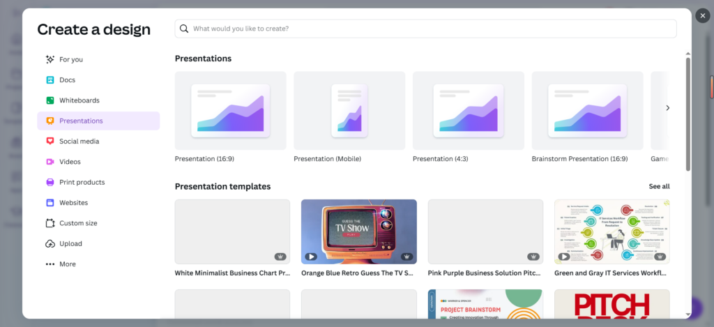 Canva: It offers easy resizing of PPT slide dimensions with a user-friendly drag-and-drop interface and multiple preset sizes for different presentation formats, ideal for online use.